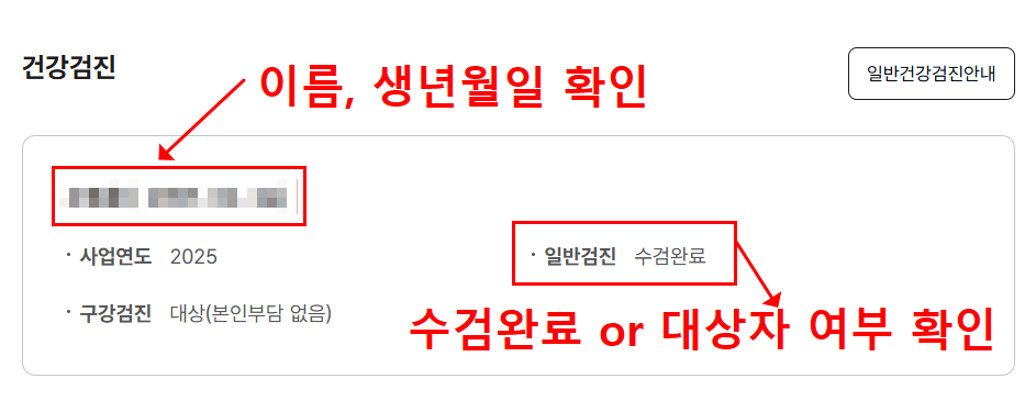 - 건강검진은 대상자 조회 후 2년에 1회 무료 또는 본인부담 비용으로 가능