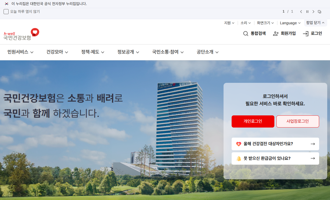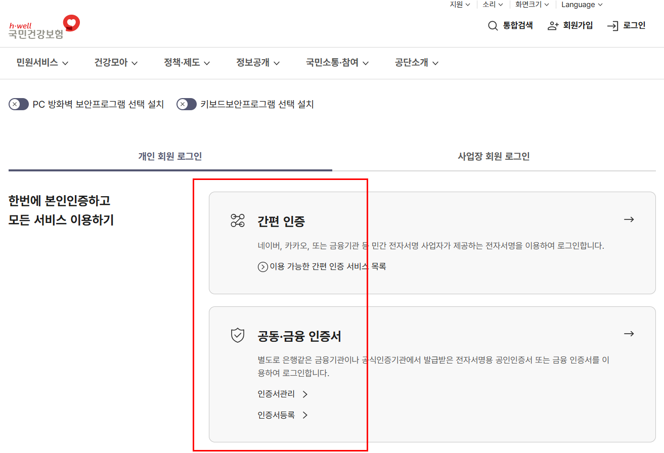 국민건강보험공단의 대상자 조회 페이지에 접속하면, 공동인증서 또는 간편 인증을 통해 로그인한 뒤