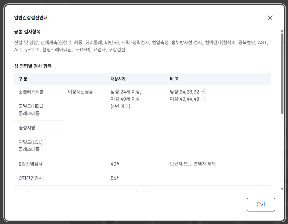 - 검진 항목은 일반검진, 암검진, 생애전환기검진 등 다양
