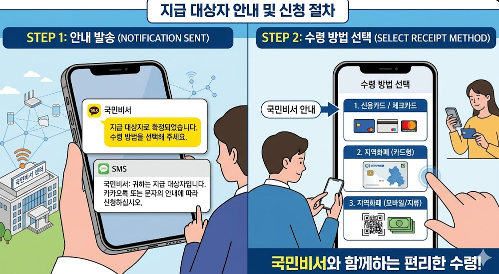 소득 하위 70% 일반 대상자는 건강보험료 기준으로 대상을 확정한 뒤 별도 안내를 통해 신청하는 방식이 될 가능성이 높습니다. 지난해 민생회복 소비쿠폰 때는 카드사 앱·홈페이지·지역화폐 앱에서 간단히 선택하는 방식이었습니다. 이번에도 동일하거나 유사한 방식으로 진행될 예정이며, 지급 개시 전 국민비서 알림 서비스를 통해 안내가 발송됩니다. 즉 완전한 자동지급이 아니라 수령 방법(카드·지역화폐)을 선택하는 간단한 절차가 있을 수 있습니다.