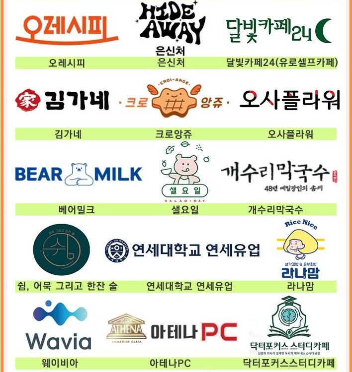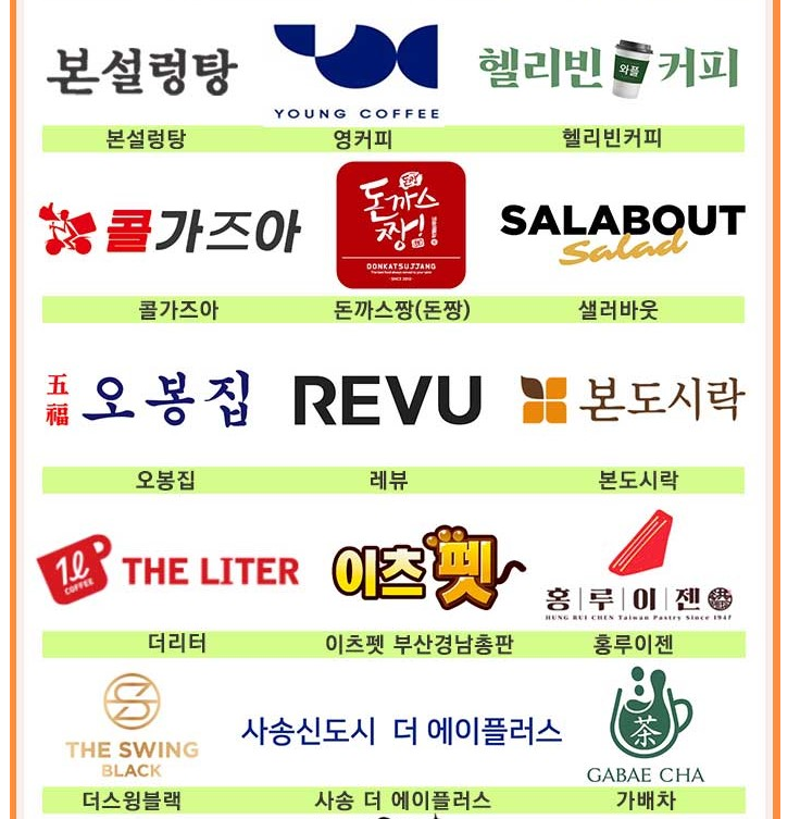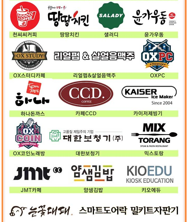 - 외식업 : 카페, 고기, 치킨, 패스트푸드, 한식, 일식, 제빵 등