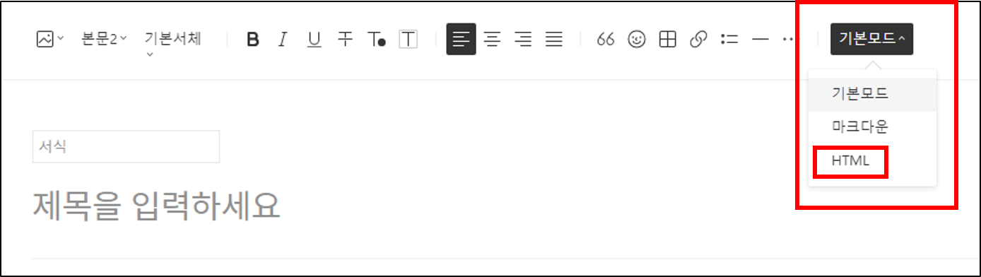 4. 기본모드 부분을 클릭하고 HTML을 클릭합니다.