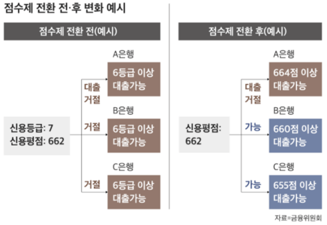 금융위원회에 따르면 신용등급제로 했을 경우 등급 내 하위 점수와 상위점수에 있는 사람이 같은 등급을 받게 되므로 인해 신용점수 자체가 높음에도 불구하고 금리적 혜택을 못 받는 등의 문제가 있어서 신용점수제로 바뀌게 되었습니다.