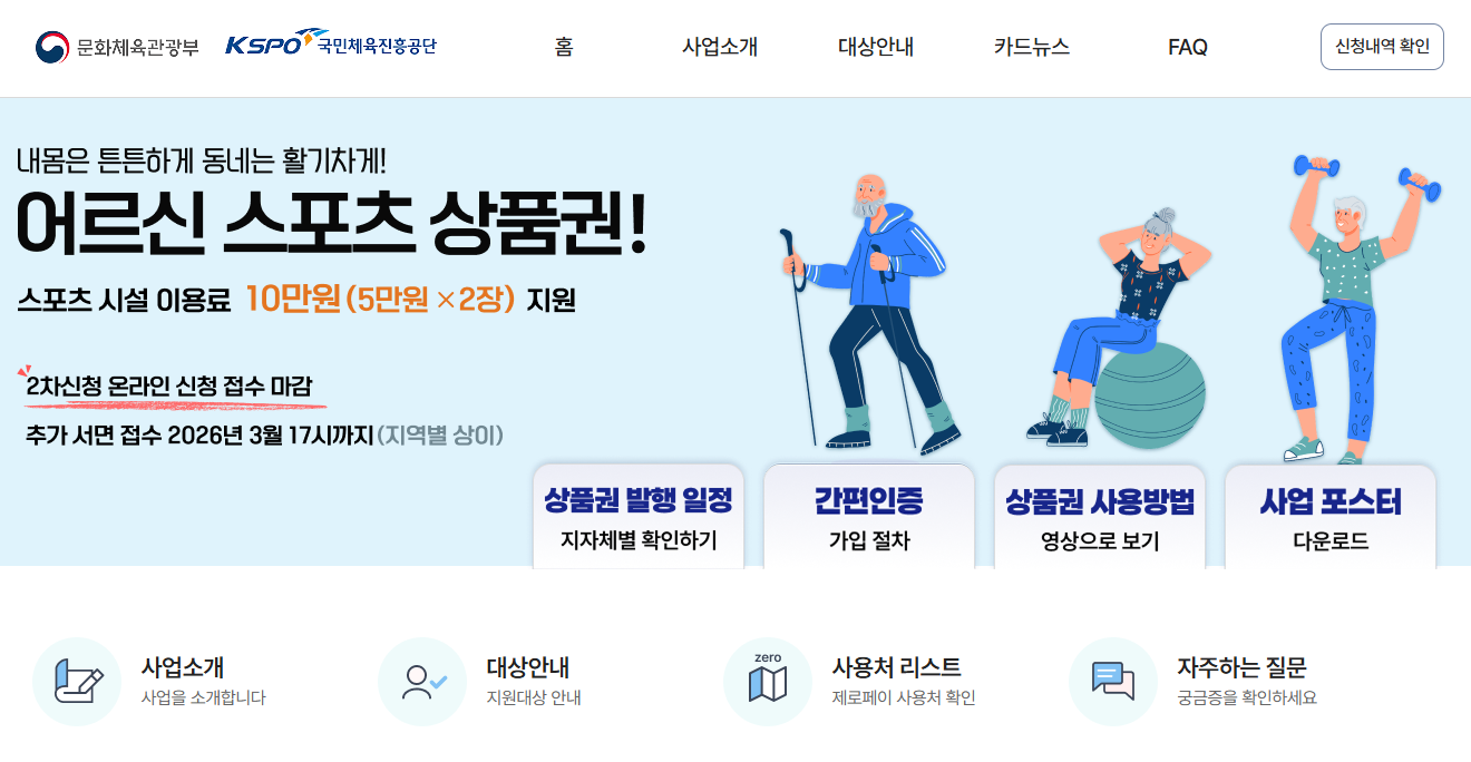 만 65세 이상 기초연금 수급 어르신이라면 최대 15만 원의 스포츠 상품권을 무료로 받을 수 있습니다. 문화체육관광부와 국민체육진흥공단이 함께 운영하는 어르신스포츠상품권은 전국 4만 3천여 개 가맹 스포츠시설에서 사용할 수 있는 복지 바우처입니다. 2026년 신청대상·신청방법·사용처·가맹점 찾는 방법까지 한 번에 정리해드리겠습니다.