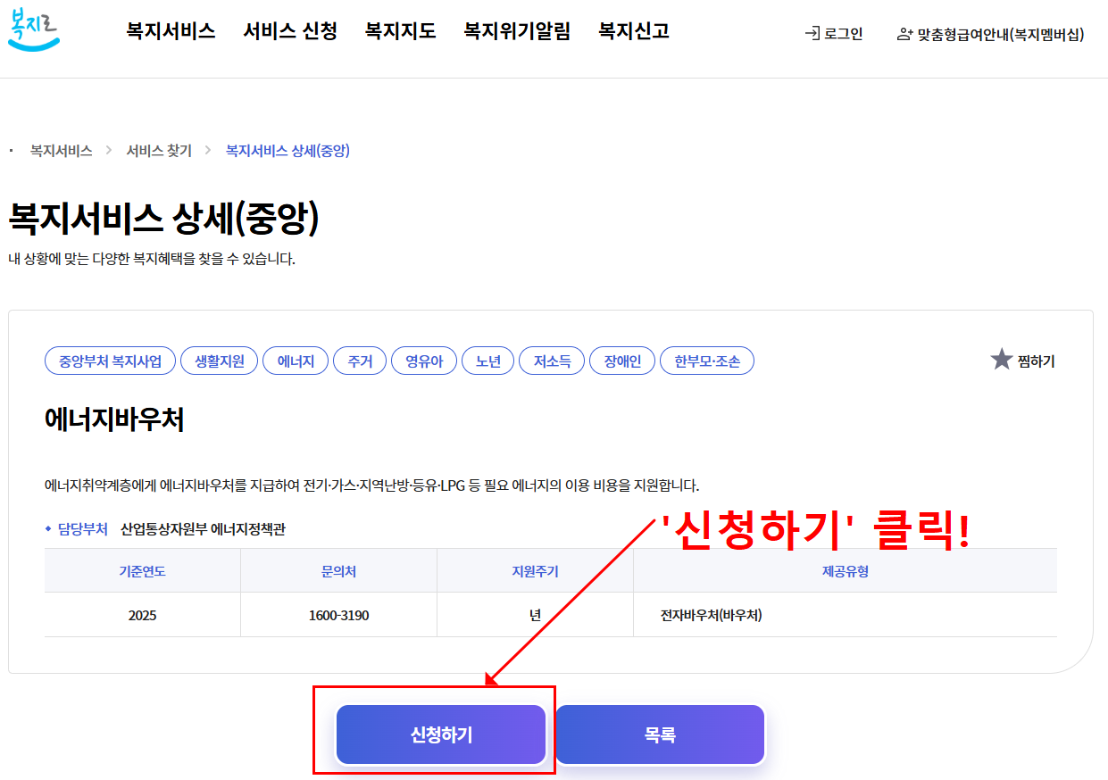 온라인 신청 (복지로 홈페이지) 복지로 바로가기 공동인증서 또는 간편인증을 통해 로그인 후 신청 신청 메뉴에서 '에너지바우처' 선택 후 항목 입력
