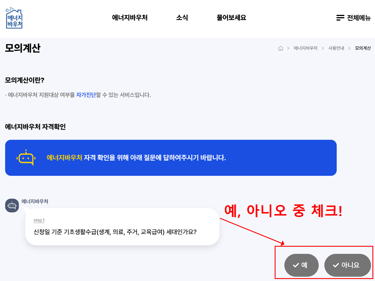 에너지바우처 공식 홈페이지에서는 몇 가지 간단한 질문에만 답하면 본인의 지원 가능 여부를 바로 확인할 수 있습니다.