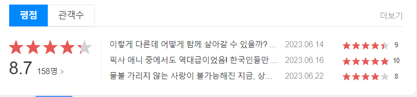엘리멘탈 영화의 특징은 미국에서는 흥행을 얻지 못했으나, 우리나라에서 인기를 얻었다는 점입니다. 이는 아마도 동양의 문화가 첨가되었고 우리나라 사람들이 공감할만한 스토리와 요소들이 많기 때문인것 같습니다. 감독은 본인이 이민자로 살게 된 경험을 토대로 스토리를 만들었다고 하는데요, 스토리의 문화적인 요소들이 우리나라의 문화와 많이 닮아있어 많은 사람들이 공감하는 영화가 된 것 같습니다. 아이가 있는 부모님이라면 꼭 봐야 되는 영화인 것 같습니다. 아이들과 함께 미래를 함께 얘기할 수 있는 그런 영화이기도 한 것 같습니다.