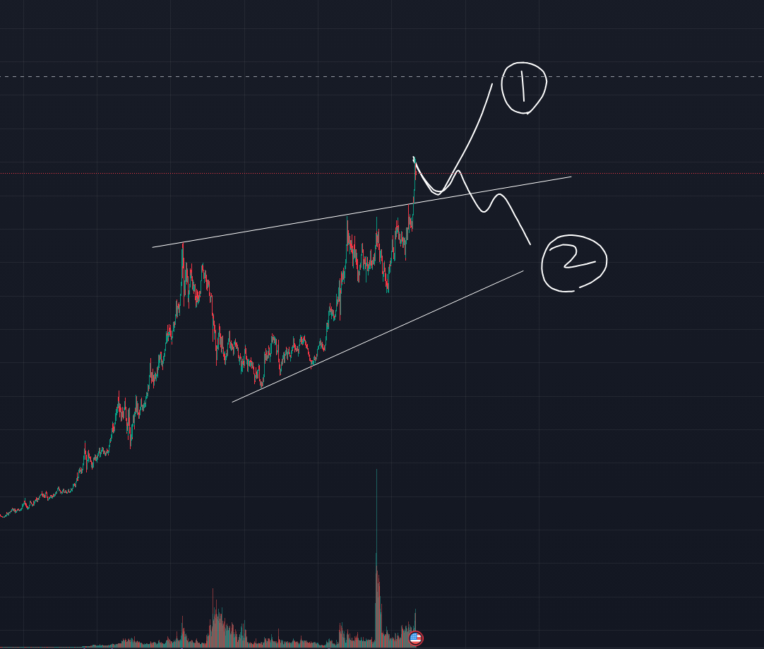 중요한 지점이 1번처럼 지지선에 맞고 그대로 상승할지, 약 상승후 하락할지를 확인하는 것이 중요합니다. 현재 기준으로는 지지선 까지는 떨어지는 방향이 맞는것 같습니다.