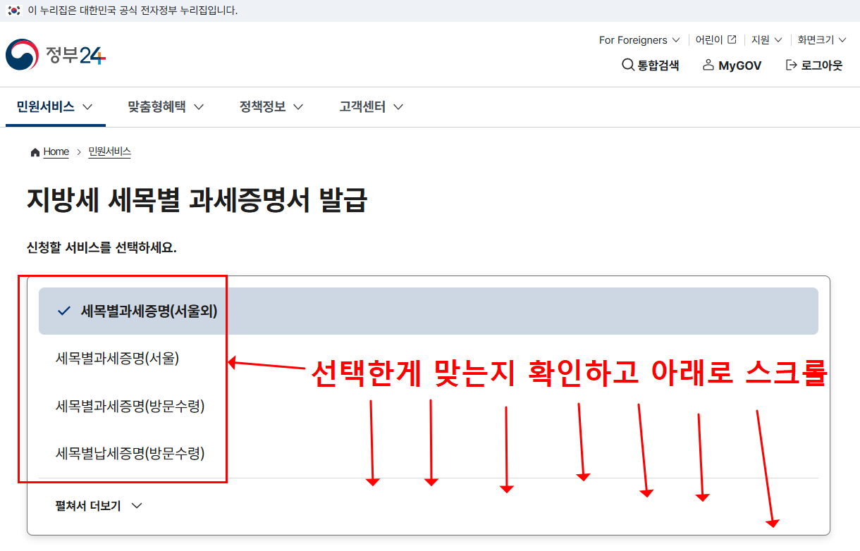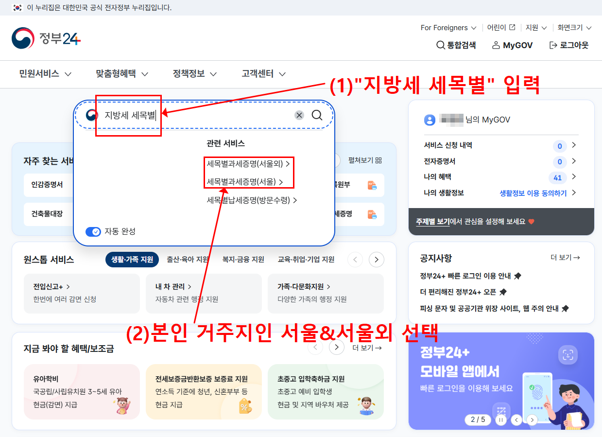(2) 민원서비스 → '세목별 과세증명서' 검색