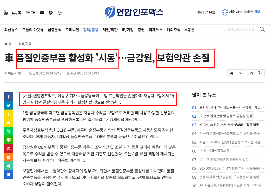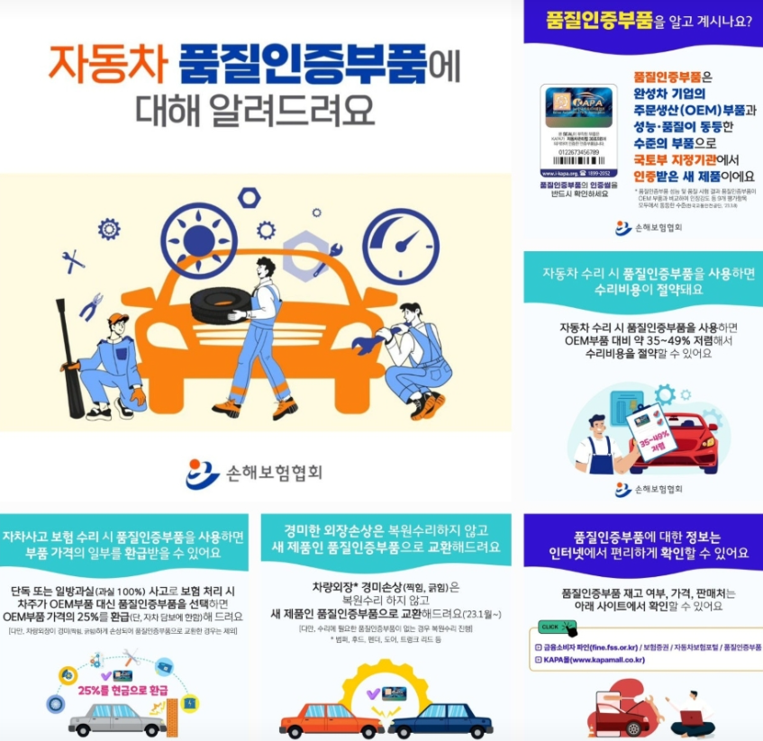 금융감독원이 자동차 보험 약관을 개정하면서 보험 수리 시 기본 적용 부품이 ‘순정’에서 ‘품질인증 부품’으로 변경됩니다.
