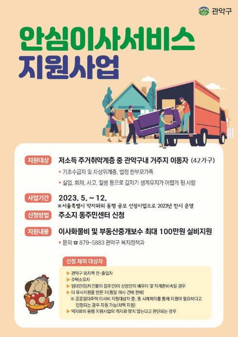 관악구에서는 기초생활 수급자 및 차상위계층이 관악구 내로 이사할 경우에 이사비를 100만원 실비로 지원하기도 합니다. 관악구에서 지원하는 이사비는 12월까지 관악구 복지정책과로 문의하시기 바랍니다(02-879-5883)