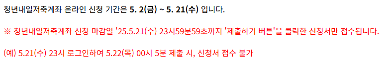 올해 청년내일저축계좌 신청 기간은 단 2주뿐입니다. 작년보다 기간이 짧아졌기 때문에 준비를 서두르는 게 중요해요.