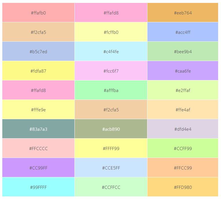 부드러운 색감의 파스텔 톤 컬러 색상표 코드입니다. 색상코드를 작업중인 HTML에서 샵(#)부분에 있는 영문과 숫자를 지우고 내가 원하는 색상표의 코드를 그대로 적으면 됩니다.