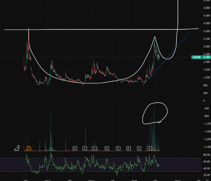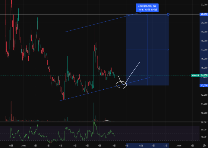 - 차트분석: 최근 급등 후 조정 구간으로, 과거 상승이 멈춘 지점에서 지지 형성이 나타남. 캡앤핸들 패턴 가능성 있으며, 패턴 성립 시 추가 상승 기대. 자세한 분석과 타이밍은 상세 분석글을 참고하세요.