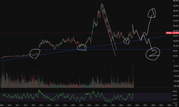 - 차트분석: 2009년 이후 장기 상승 추세를 유지 중이며, 장기 추세선 하단 이탈 가능성 낮음. 장기 투자자는 추세선 근처에서 매수 시 장기 수익 기대. 자세한 분석과 타이밍은 상세 분석글을 참고하세요.